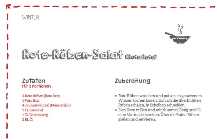 • Den Kren reißen und mit Kümmel, Essig und Öl eine Marinade bereiten. Über die Roten Rüben gießen und servieren.